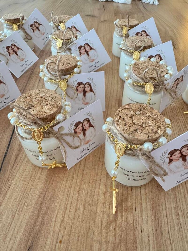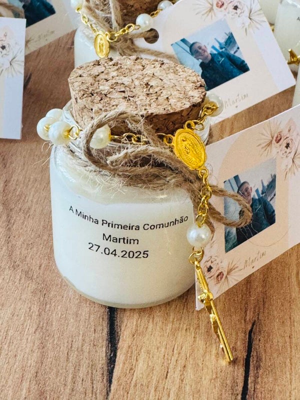 Cette bougie parfumée en cire de soja naturelle, accompagnée d’un chapelet et d’une image sainte ou photo personnalisée, est le cadeau parfait pour célébrer un baptême ou une communion.